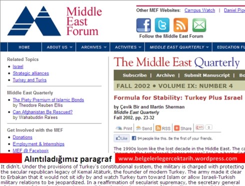 Çevik Bir ve Martin Sherman, “Formula for Stability: Turkey Plus Israel” (Istikrar için formül: Türkiye artı Israil), “Middle East Quarterly” isimli Amerikan (ABD) Dergisi, Güz Sayısı (Fall) : 2002, Cild (Volume) : 9, Numara (Number) : 4.