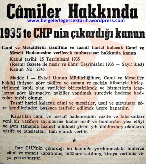 Belge 1: Camilerin satışını gösteren yasa. Sayın Kılıçdaroğlu belge konuşuyor bak. Tasnif harici camii ve mescitler kendilerinden başkaca ifade edilmek üzere kapatılır. Bu caminin çıkmasının ardından Türkiye’nin her vilayetinde camiler kapatılmaya başlandı.