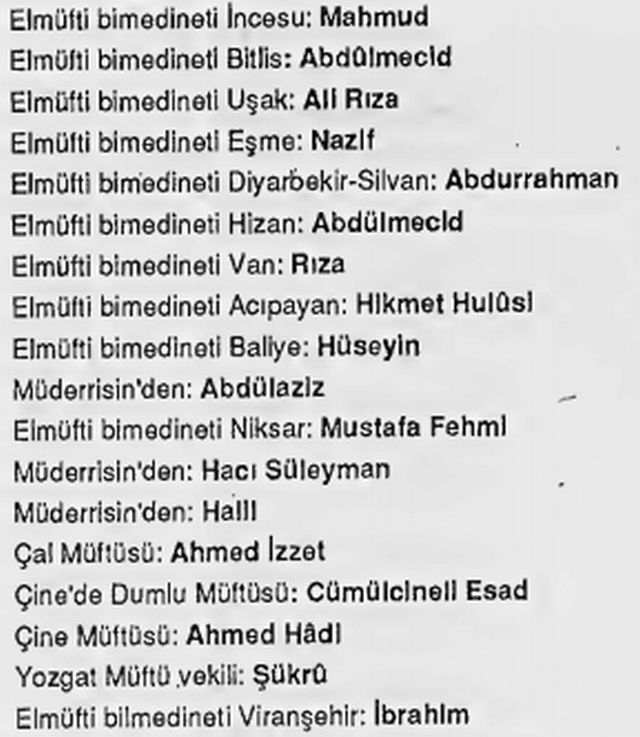 Trabzon’da; Müftü Mahmut Imadeddin, Ahmet Mahir, Mehmet Izzet (Akçaabat Müftüsü), Mehmet Kamil (Maçka Müftüsü), Müderris Ibrahim Cûdi ve Müderris Hatipzade Emin Efendi,