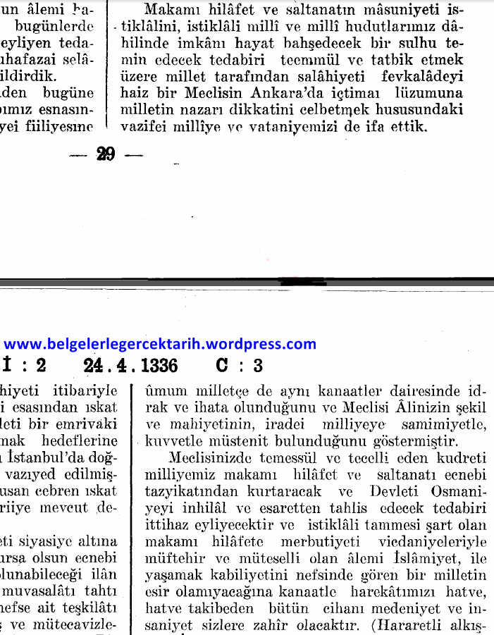 Meclisimizde oluşan ve beliren milli kudretimiz, Hilâfet makamı ve saltanatı yabancı baskısından kurtaracak ve Osmanlı devletini dağılma ve tutsaklıktan kurtarma önlemleri alacaktır. Tam bağımsızlığa sahip, hilâfet makamına vicdani bağlılığı ile övünen, islâm dünyası içinde yaşama anlayışını kendinde gören bir milletin tutsak olamayacağı inancıyla, davranışlarımızı adım adım izleyen bütün medeni dünya ve insanlık sizlere yardımcı olacaktır. (Hararetli alkışlar)”[6]