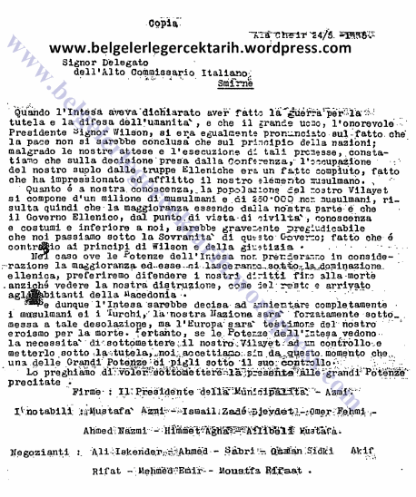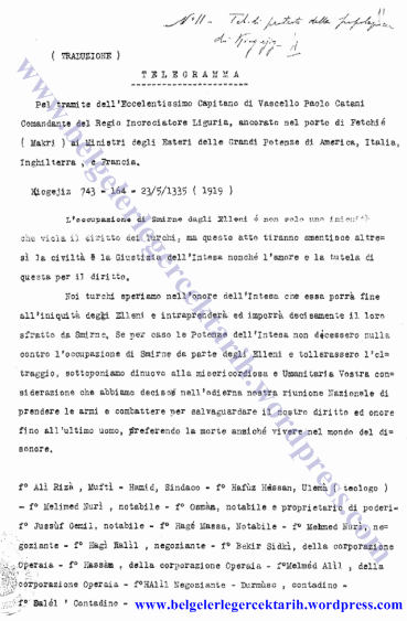 1335 senesi mayısının yirmi üçüncü cuma günü Fethiye’de kaza-yı sekene tarafından akd olunan içtimada ittihaz edilen mukarrerâtla mukarrerât-ı mezkure mucibince düvel-i itilâfiye-yı muazzama ve bî-taraf hükümetler mümessil-i siyasî ve sefarethanelerine arz-ı taht-ı vücubda olan protestonun suret-i musaddıkaları leffen takdim edilmiştir. Tehlike-i milliyeyi îzaleye mâtuf olan evrak-ı mezkurenin devlet-i metbûa-ı fahîmenize arz ve iblağının rica ile takdim-i ihtiramât eyleriz.” 23 Mayıs 1335.