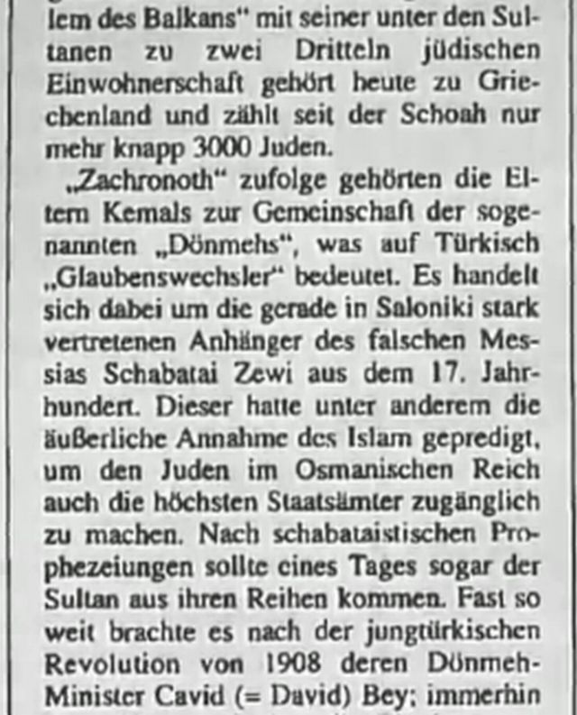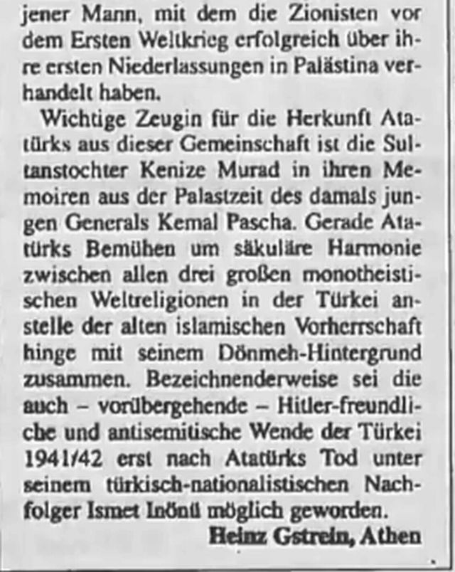 Derginin Atina muhabirlerinden Heinz Gstrein’in kaleme almış olduğu yazıda bu sene de ölüm yıldönümünde Türk basınında tartışılan M. Kemal’in geçmişiyle ilgili tartışmaları özetleyen bir Yunan yahudi dergisi olan “Zachronoth” adlı dergiden kesintiler alınmış.