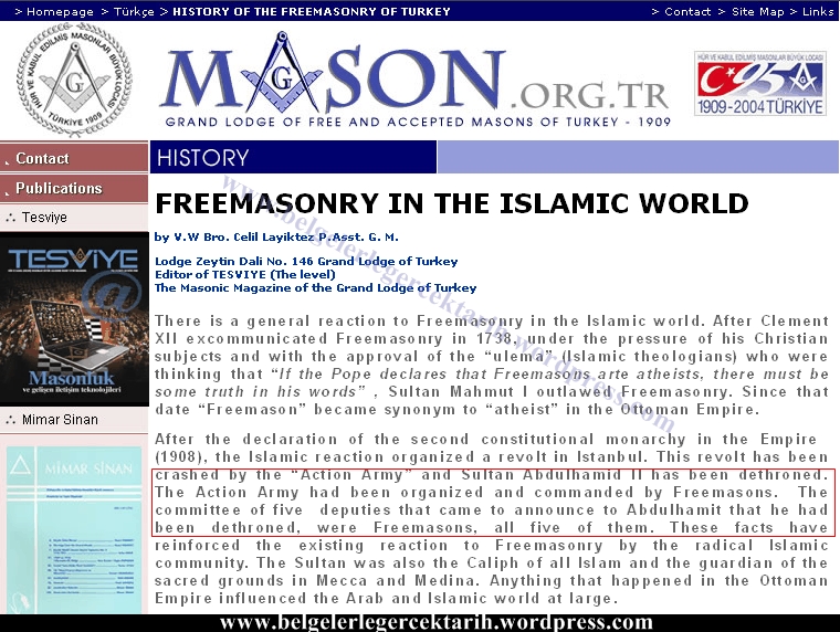 Türkiye Hür ve Kabul Edilmiş Masonlar Locası Üstadı ve locanın resmi yayın organı Tesviye Dergisi’nin editörü Celil Layiktez, dünya masonlarına ‘İslam Ülkelerinde Masonluk’ başlıklı İngilizce bir makale yayınladı. Makalesinde, Osmanlı Devleti’nde masonluğun nasıl kökleştiğini anlatan Layiktez, 2. Abdülhamid’in tahttan indirilmesine giden süreçte masonların oynadığı rolü değerlendirdi. Mason üstadı Layiktez, 1908’de 2. Meşrutiyet’in ilanından sonra ‘İslamcıların’ İstanbul’da ayaklanma çıkardığını ve bu ayaklanmanın Hareket Ordusu tarafından bastırılarak Sultan Abdülhamid’in tahttan indirildiğini söyledi. “Hareket Ordusu, masonlar tarafından örgütlendi ve yönetildi” diyen Layiktez, “Sultan Abdulhamid’e tahttan indirildiğini tebliğ eden 5 milletvekilinden oluşan heyettekilerin tamamı masondu” dedi.