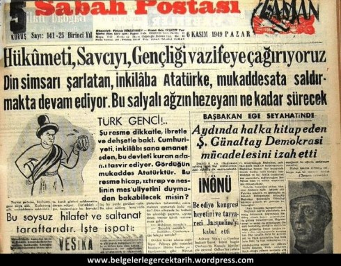 “Hükumeti, Savcıyı, Gençliği vazifeye çağırıyoruz. Din simsarı şarlatan, inkılaba Atatürke, mukaddesata (kemalistlerin mukaddesatı olsa gerek) saldırmakta devam ediyor. Bu salyalı ağzın hezeyanı ne kadar sürecek.