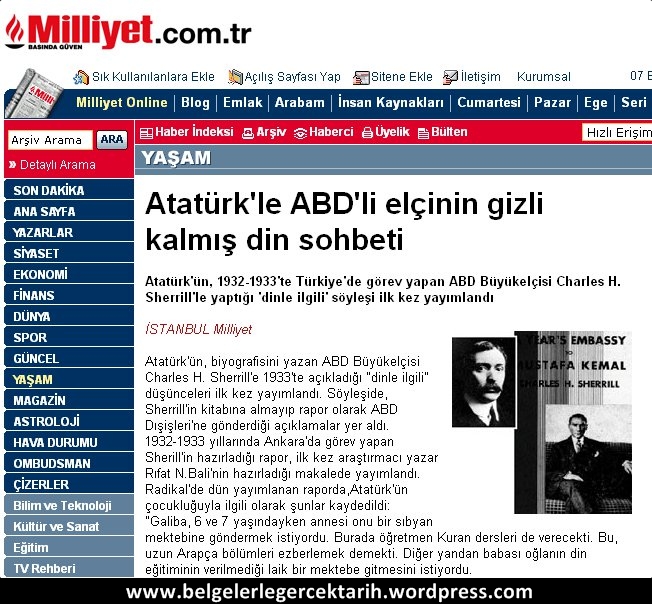 Atatürk’ün din hakkındaki görüşlerine ışık tutacak yeni bir belge ortaya çıktı. 1932-1933 yıllarında Ankara’da görev yapan ABD Büyükelçisi Charles H. Sherrill’in hazırladığı ve Atatürk’ün kendi ağzından dinle ilgili görüşlerini içeren rapor ilk kez Toplumsal Tarih dergisinde araştırmacı yazar Rıfat N. Bali’nin hazırladığı yazıda yayımlandı.