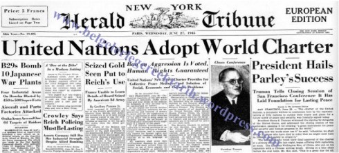 San Fransisco Konferansı’nda Birleşmiş Milletler Anayasası’nın imzalandığını bir gün sonra [27 Haziran 1945] manşetten duyuran “New York Herald Tribune” gazetesi
