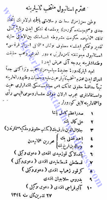 Osmanlı Ahrar Fırkası’nın Istanbul ikinci seçmenlerine Beyannamesi’nin aslı [27 Teşrin-i sâni 1324.]