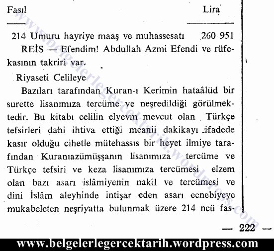 Elmalılı Hamdi Yazır’ın Kur’an-ı Kerim Tefsiri, Buhari-i Şerif’in ve dini kitapların Türkçe’ye tercüme edilmesi için Eskişehir Mebusu “sarıklı“ Abdullah Azmi Efendi’nin Meclis’e verdiği takririn tutanağı