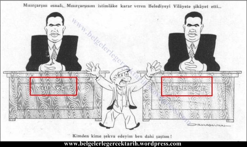 Kimi kime şikâyet edeceğini şaşıran esnaf… Akbaba dergisinde yayınlanan bu karikatür konumuzu gayet net bir şekilde özetlemektedir (KAYNAK: Akbaba Dergisi, sayı 282, 1 Haziran 1939, sayfa 5.)