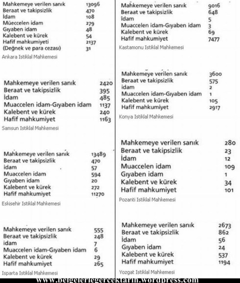 Yukarıda sunduğumuz listedeki rakamlar “resmidir” ve zikredilen bu rakamlardan daha fazla insanın idam edildiği açıktır. Listede o günün tabiriyle Bidayet Mahkemeleri olarak isimlendirilen normal mahkemeler, Harp Divanları ve ayrıca düzensiz birliklerde çoğu zaman yargı niteliğinde keyfi kararlar veren Kuvay-ı Tedibiyeler’de yargılananlar ve idama mahkum olanlar, bunlarla birlikte isyanlarda öldürülenler yer almıyor. Yalnızca bazı Istiklal Mahkemelerine sevk edilenlerin listesidir bu.