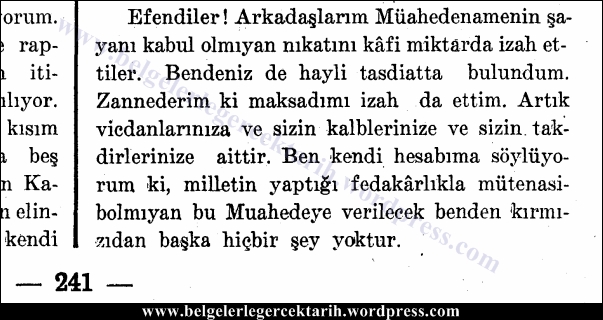 Efendiler! Arkadaşlarım Müahedenamenin şayanı kabul olmıyan nıkatını kâfi miktarda izah ettiler. Bendeniz de hayli tasdiatta bulundum. Zannederim ki maksadımı izah da ettim. Artık vicdanlarınıza ve sizin kalblerinize ve sizin, takdirlerinize aittir. Ben kendi hesabıma söylüyorum ki, milletin yaptığı fedakârlıkla mütenasib olmıyan bu Muahedeye verilecek benden kırmızıdan başka hiçbir şey yoktur.[12]