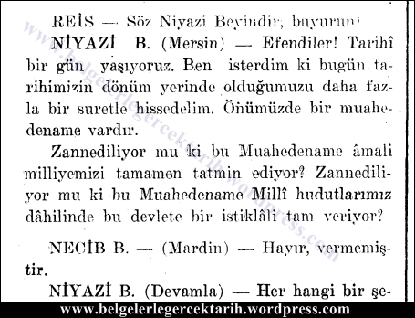NİYAZİ B. (Mersin) — Efendiler! Tarihî bir gün yaşıyoruz. Ben isterdim ki bugün tarihimizin dönüm yerinde olduğumuzu daha fazla bir suretle hissedelim. Önümüzde bir muahedename vardır. Zannediliyor mu ki bu Muahedename amali milliyemizi tamamen tatmin ediyor? Zannediliyor mu ki bu Muahedename Millî hudutlarımız dâhilinde bu devlete bir istiklâli tam veriyor?