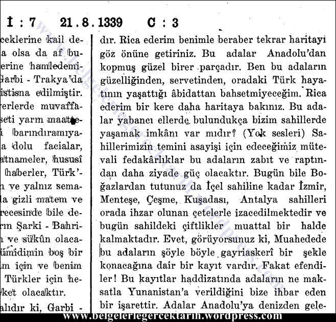 “Efendiler, Lozan Muahedesinin hudutlar safhasında Türklere gösterdiği insafsızlık bundan ibaret değildir. Boğazlara hâkim olan yerlerde bâzı adalar vardır. Meselâ, bunlardan bir kısmı İmroz ve Bozcaada’dır. Bunlar bize bâzı kuyut ve şurutla iade olunuyor. Fakat aynı derecede Boğazlara hâkim Semendirek, Limni vardır. Bunlar unutuluyor. Herkesin malûmudur ki, Boğazlara karşı olan tasallutlar, taarruzlar Limni, Mondros limanında ihzar olunur. Niçin bu memleketler, bu adalar Türkiye’ye iade olunmuyor? Benim fikrimce bu itibarla ve daha birçok itibarlarla Lozan Konferansının doğurduğu bu Muahedename nâkıstır, nâtamamdır ve pek çok tehlikeli mevaddı havidir. Boğazlardan sonra Midilli, Sakız ve Sisam adaları vardır. Rica ederim benimle beraber tekrar haritayı göz önüne getiriniz. Bu adalar Anadolu’dan kopmuş güzel birer parçadır. Ben bu adaların güzelliğinden, servetinden, oradaki Türk hayatının yaşattığı âbidattan bahsetmiyeceğim. Rica ederim bir kere daha haritaya bakınız. Bu adalar yabancı ellerde bulundukça bizim sahillerde yaşamak imkânı var mıdır? (Yok sesleri) Sahillerimizin temini asayişi için edeceğimiz mütevali fedakârlıklar bu adaların zabıt ve raptından daha ziyade güç olacaktır. Bugün bile Boğazlardan tutunuz da İçel sahiline kadar İzmir, Menteşe, Çeşme, Kuşadası, Antalya sahilleri orada ihzar olunan çetelerle izacedilmektedir ve bugün sahildeki çiftlikler muattal bir halde kalmaktadır. Evet, görüyorsunuz ki, Muahedede bu adaların şöyle böyle gayriaskerî bir şekle konacağına dair bir kayıt vardır. Fakat efendiler ! Bu kayıtlar haddizatında adaların ne maksatla Yunanistan’a verildiğini bize ihbar eden bir işarettir. Adalar Anadolu’ya denizden gelecek istilâ kuvvetlerini durduracak birer kale idi, tâbirimi mazur görünüz, ben bunlara birer sabit, donanma diyeceğim. Bu adalar sırf Anadolu’nun müdafaası için yaratılmıştır. Halbuki müdafaa ise en haklı, en meşru bir haktır. Halbuki Yunanistan’ın elindeki bu adalar, Anadolu’ya vâki olacak, taarruzun, tasallutun, hücumun ilk karakollarıdır. Bu Muahede tarruz hakkını tesbit eden, meşru göstermek istiyen bir vesikadır. Muahedeye mâkuldür, münsiftir diyebilmek için bu adaları muhtar bir şekle sokmak icabederdi. O bile yapılmamıştır. Efendiler ! Yunanistan’a bahşedilen Sisam adasından aşağıya doğru gidecek olursak daha birtakım adalara tesadüf ederiz. Bunlar bizim vaktiyle Cezairi Bahrisefid vilâyetimizin birer cüzü ferdi idi. İtalya Muharebesinden sonra diplomasi lisanında bunlara 12 adalar diyorlar. Bunlar içerisinde Rodos gibi, Istanköy, Meyis gibi Anadolu’ya bitişik ve Türklerle meskûn kıymetli adalar vardır. (…) Efendiler! Adaların Anadolu’ya olan münasebetini diğer adalarda söylemiştim. Bu adalarda da o münasebat ve alâka maaziyadetin vardır. Bugün Kuşada’dan tutunuz da ta Mersin’e kadar bütün sahillerimiz bu adalarda toplanan iktisadî çetelerin mâruzu i’tisafı olmaktadır. Harb senelerindeki gümrük varidatımıza sulh senelerimizdeki gümrük varidatımızı mukayese edecek olursak o hudutlarımızı beklemek için vücuda getirdiğimiz teşkilâtın bize neye malolduğu tezahür eder. Adalar, bence İtalyanların elinde Anadolu’ya doğru uyanacak bir isti’mar ve istismar siyasetinin bir mukaddemesidir. (…) Binaenaleyh, bu tehlikeleri ben gözönünde tutarak bu Muahedeyi reddetmek mecburiyetindeyim.”[11]