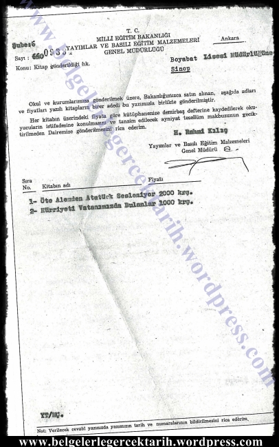 Yayımlar ve Basılı Eğitim Malzemeleri Genel Müdürü H. Rahmi Kılıç imzasıyla Boyabat Lisesi Müdürlüğüne (Sinop) şu yazı gönderiliyor: