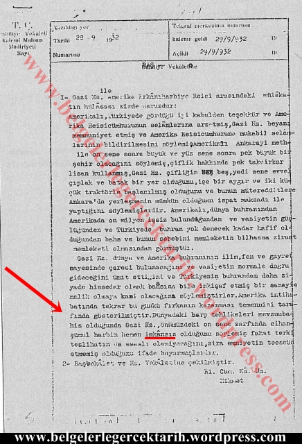 Kaldı ki, M. Kemal Atatürk’ün Mac-Arthur ile yaptığı konuşmanın özeti 1 gün sonra, yani 28 Eylül’de resmi bir raporla Cumhurbaşkanlığı Genel Sekreteri Hikmet Bayur tarafından Içişleri Bakanlığı’na yazılmıştı ve bu raporda yazanlar yukarıdaki sözleri kesin bir şekilde yalanlıyor.