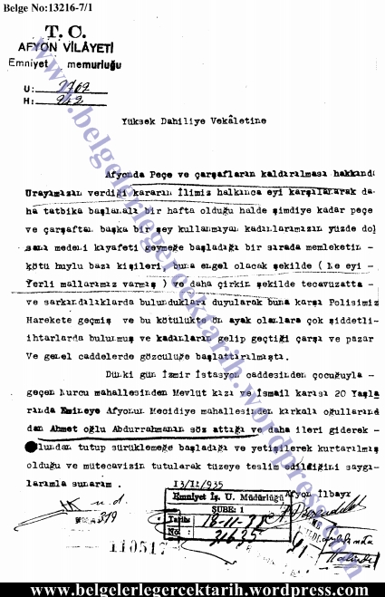 13.11.1935 tarihinde Afyon’dan Içişleri Bakanlığı’na gönderilen bir yazıda, kadınların yüzde doksanının “medeni” kıyafet giymeye başladığı ve kötü huylu bazı kişilerin bunu engellemeye çalıştıkları bildirilmektedir.[29]