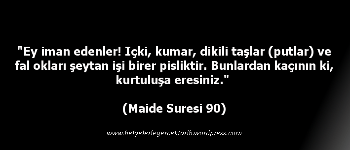 Allahu Teala Kur’an’da; “Ey iman edenler! Içki, kumar, dikili taşlar (putlar) ve fal okları şeytan işi birer pisliktir. Bunlardan kaçının ki, kurtuluşa eresiniz.” (Maide Suresi 90) buyuruyor.