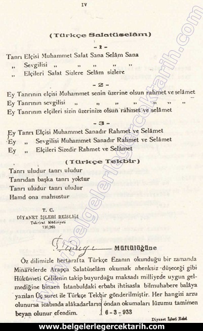Ezan ardından 1932 yılında Salat-ü Selam ve Tekbirin de Türkçe okunmasına karar verilmiş