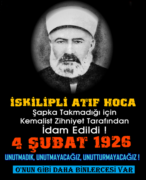 “Irtica kitapları yazarı olup Istiklal mahkemesince idama mahkum olan Iskilipli Atıf Hoca ile Babaeski Müftüsü Ali Rıza Hoca haklarında idam kararı bu sabah infaz edilmiştir.”[48]