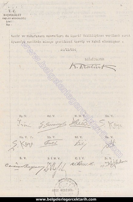 M. Kemal Atatürk ayasofyayi kapatti mi, M. Kemal ayasofya, M. Kemal Atatürk ayasofya kararname, M. kemal ayasofya imza, Atatürk ayasofya imza sahte mi