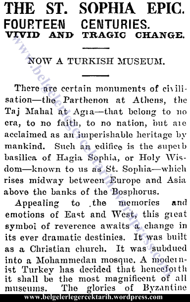 1935’te yani M. Kemal daha hayatta iken, Cumhuriyet gazetesinde yayınlanan bir haberde, Brüksel’de çıkan “Byzantion” adlı bir derginin 382’nci sayfasında Ayasofya’dan bahsedildiği belirtilmektedir.
