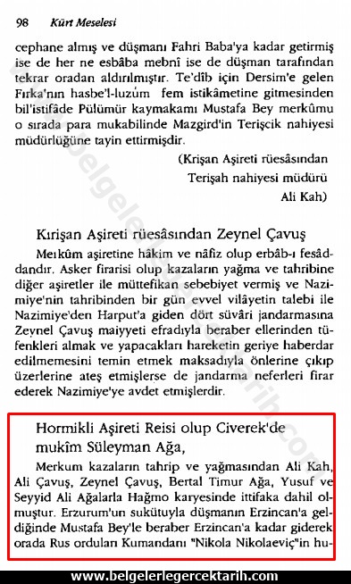 “Hormikli Aşireti Reisi olup Civerek’de mukim Süleyman Ağa, Merkum kazaların tahrip ve yağmasından Ali Kah, Ali Çavuş, Zeynel Çavuş, Bertal Timur Ağa, Yusuf ve Seyyid Ali Ağalarla Hağmo karyesinde ittifaka dahil olmuştur. Erzurum’un sukütuyla düşmanın Erzincan’a geldiğinde Mustafa Bey’le beraber Erzincan’a kadar giderek orada Rus orduları Kumandanı ‘Nikola Nikolaeviç’in huzuruna çıkarak otuzüç seneden beri müştaki oldukları (hasretini çektikleri) Rus Hükumet-i adilesine intizar ettiklerini ifade etmekle beraber arz-ı dehalet etmişlerdir.”[1]