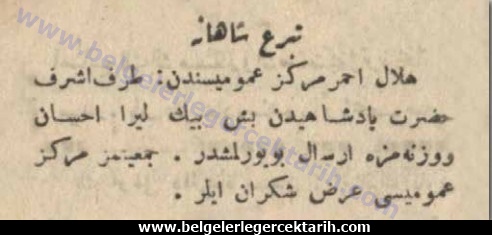 Sultan Vahideddin 10.9.1922’de Türk askerlerine verilmek üzere Hilâl-i Ahmer için açılan yardım kampanyasına 5.000 TL bağışladı. Hilâl-i Ahmer (Kızılay) 11 Eylül tarihli Ikdam gazetesinde Padişah’a teşekkür ediyor.