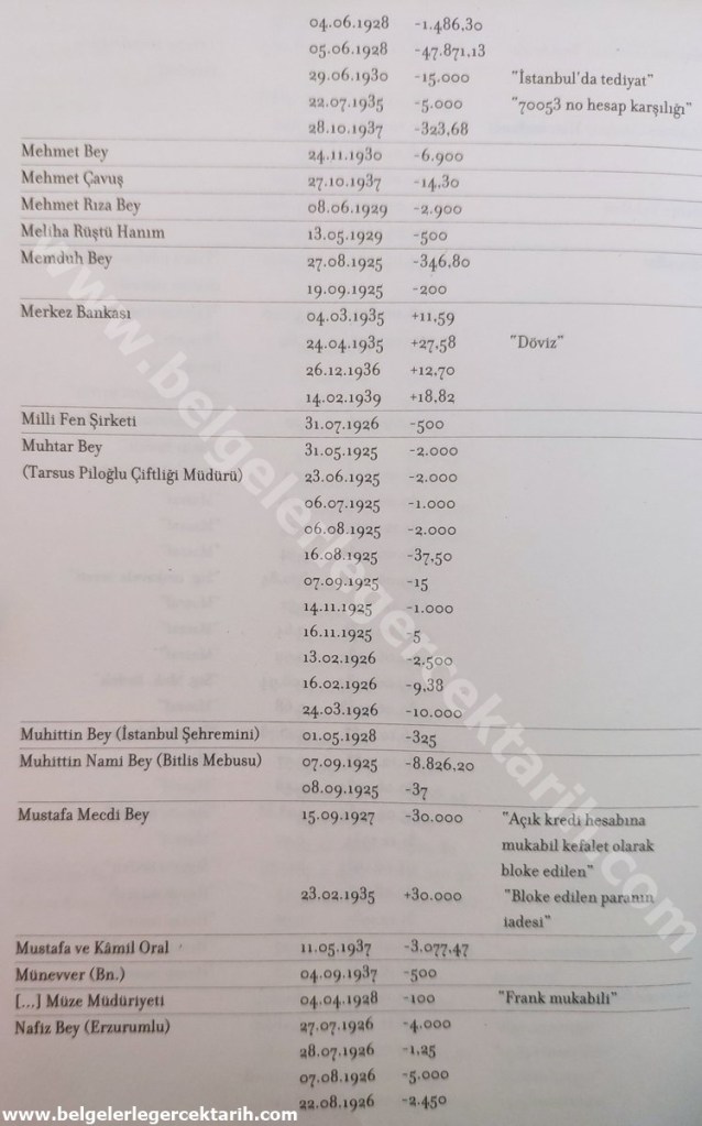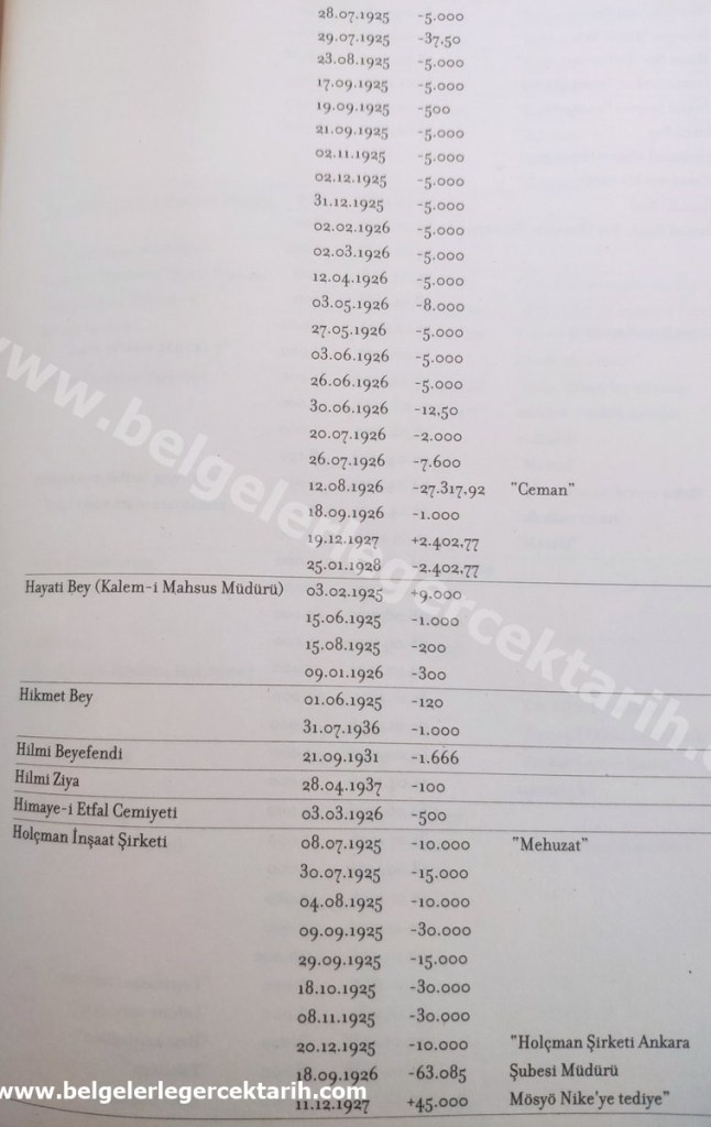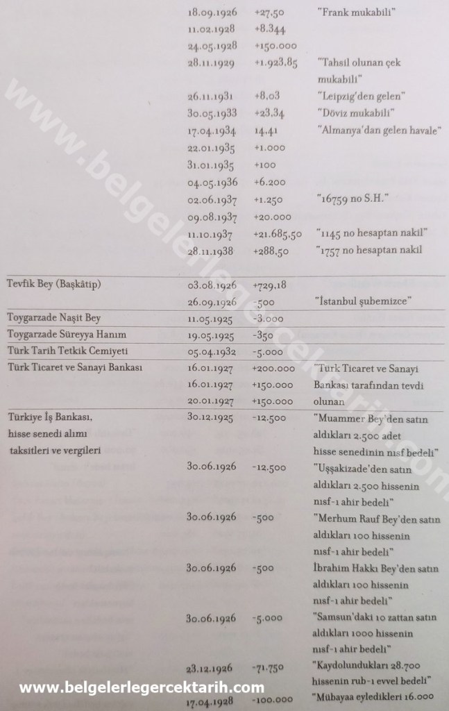 –Benzer bir duruma 19 Aralık 1926’da da rastlanıyor. Bu tarihte +1.668,41 lira olan hesaptan 20 Aralık 1926 tarihinde Hasan Rıza (Soyak) 6.778,80 lira çekince bakiye -5.110,39 liraya düşüyor.