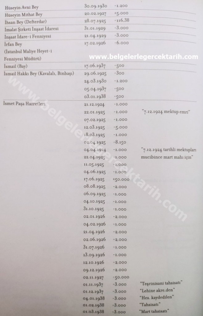 2 numaralı hesaptan 21 Aralık 1924, 7 Şubat 1925, 12 Mart 1925 ve 2 Nisan 1925 tarihlerinde toplam olarak 15.150 lira; 4 numaralı hesaptan 11 Mart 1926 ve 8 Nisan 1926 tarihlerinde 25.000’er liradan 50.000 lira olmak üzere toplam 65.150 lira ödeme yapıldığı görülmektedir. Dolayısıyla, M. Kemal’in Iş Bankası’ndaki hesaplarından, 1924 yılından ölümüne kadar Ismet Inönü’ye 365.150 lira ödendiği anlaşılmaktadır.