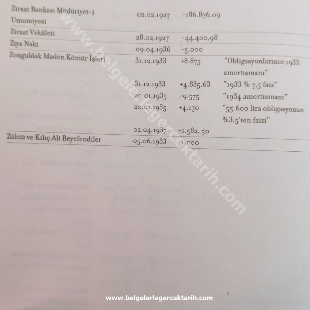 –1926 yılı sonu itibariyle zimmet bakiyesi veren hesap, 16 Ocak 1927 tarihinde, “Türk Ticaret ve Sanayi Bankası tarafından tevdi olunan” önce 200.000, daha sonra 150.000 lira, yani toplam 350.000 liranın yatırılmasıyla matlup bakiyesi veriyor ve 4 gün sonra yine aynı bankadan yatırılan 150.000 lira ile matlup miktarı 494.490,34 liraya ulaşıyor.