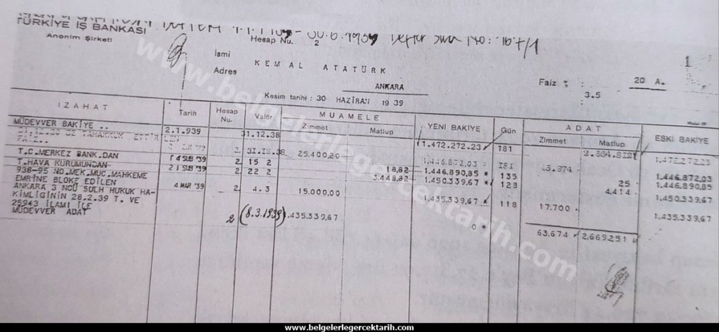 31 Aralık 1938 tarihinde söz konusu hesapta görülen miktar, banka tarafından 3. Sulh Hukuk Mahkemesi’ne bildirilen ve M. Kemal’in Genel Sekreteri Hasan Rıza Soyak’ın kitabında da zikredilen miktara uygundur. Ancak 28 Şubat 1939 tarih ve 25943 sayılı ilam ile mahkeme emrine bloke edilen ve bankaca 8 Mart 1939 tarihinde kesinleştirilen miktar 1.435.339,67 liradır.[5]