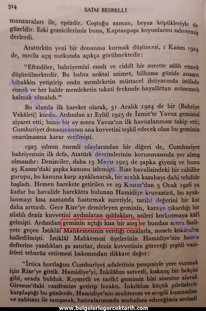 Kemalistliğinde zerre şüphe bulunmayan Saim Besbelli, “Türk Tarih Kurumu” tarafından neşredilen yıllık “Atatürk Konferansları”nın beşinci sayısında yer alan “Atatürk ve Türk Denizciliği” başlıklı makalesinde, Hamidiye gemisinin “ateş açtığını” şu sözlerle ifade eder: