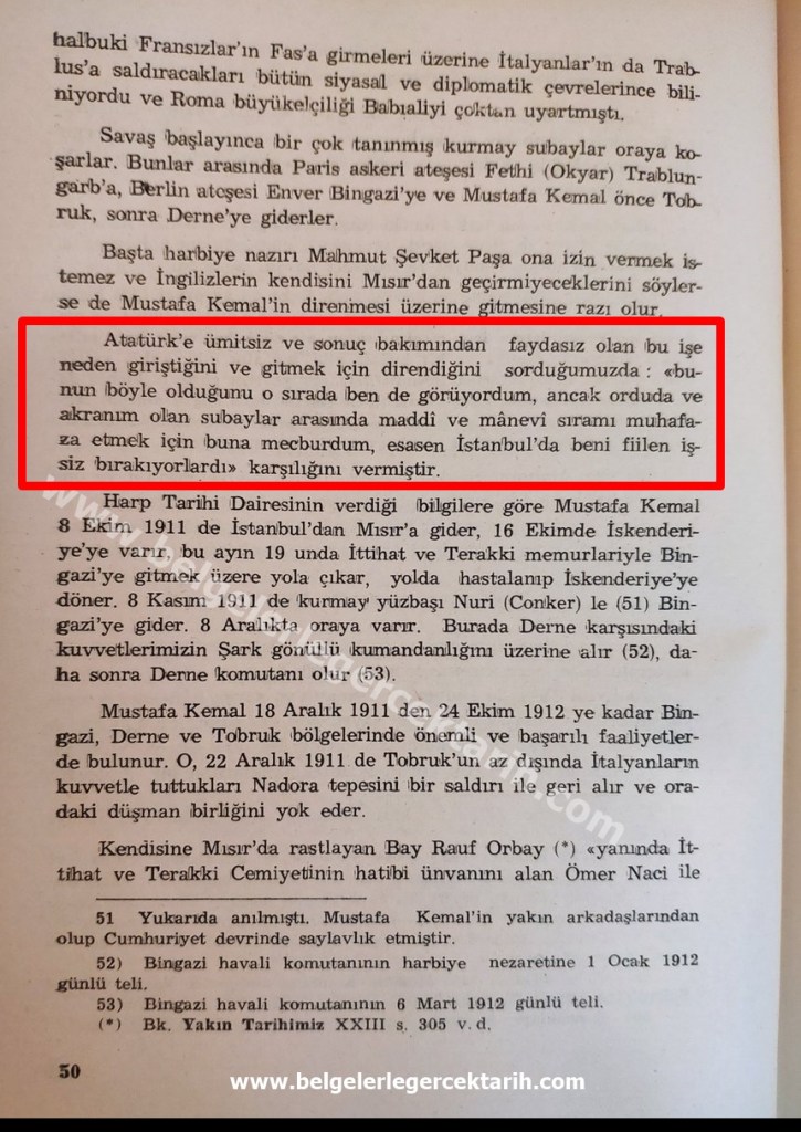 “Mustafa Kemal, bu seferin akıllıca bir iş olduğuna inanmıyordu. Asıl tehlikelerin Balkanlardan geleceğini pek iyi bilmekteydi. Arkadaşları, onun aksine, her şeyi olduğu gibi kabul ediyor, Batı Trablus’un işgalinin Osmanlı Imparatorluğunun tasfiyesi yolunda atılmış bir adım daha olduğunu ve bu gidişin ancak Anavatan dolaylarında önlenebileceğini kavrayamıyorlardı. Ama o da, kamu isteklerinin akıntısına karşı gelemezdi. Savaş alanındaki başarıları, parti içindeki durumunu sağlamlaştırmaya da yardım edebilirdi. Hem zaten nasılsa burada, Istanbul’da, Mahmut Şevket Paşa ona göz açtırmıyordu. Ayrıca Enver’den geri kalmayı da kendine yediremezdi. Böylece Enver’e katılmak üzere gemiyle yola çıktı.”[5]