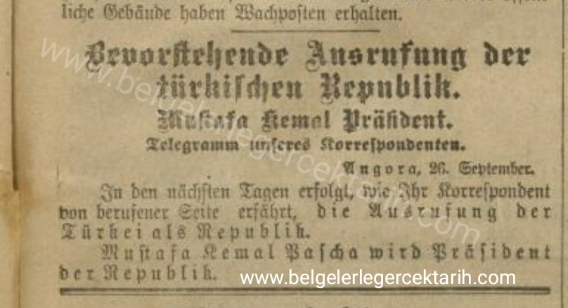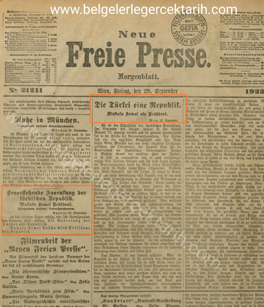 Bahsi geçen gazetenin muhabiri bu haberi 26 Eylül’de Ankara’dan Viyana’ya bildirdi. 28 Eylül’de ise gazetede neşredildi ve aynı nüshada “Türkiye bir Cumhuriyet-M.Kemal Cumhurbaşkanı” başlıklı bir makale de yer aldı.[1]