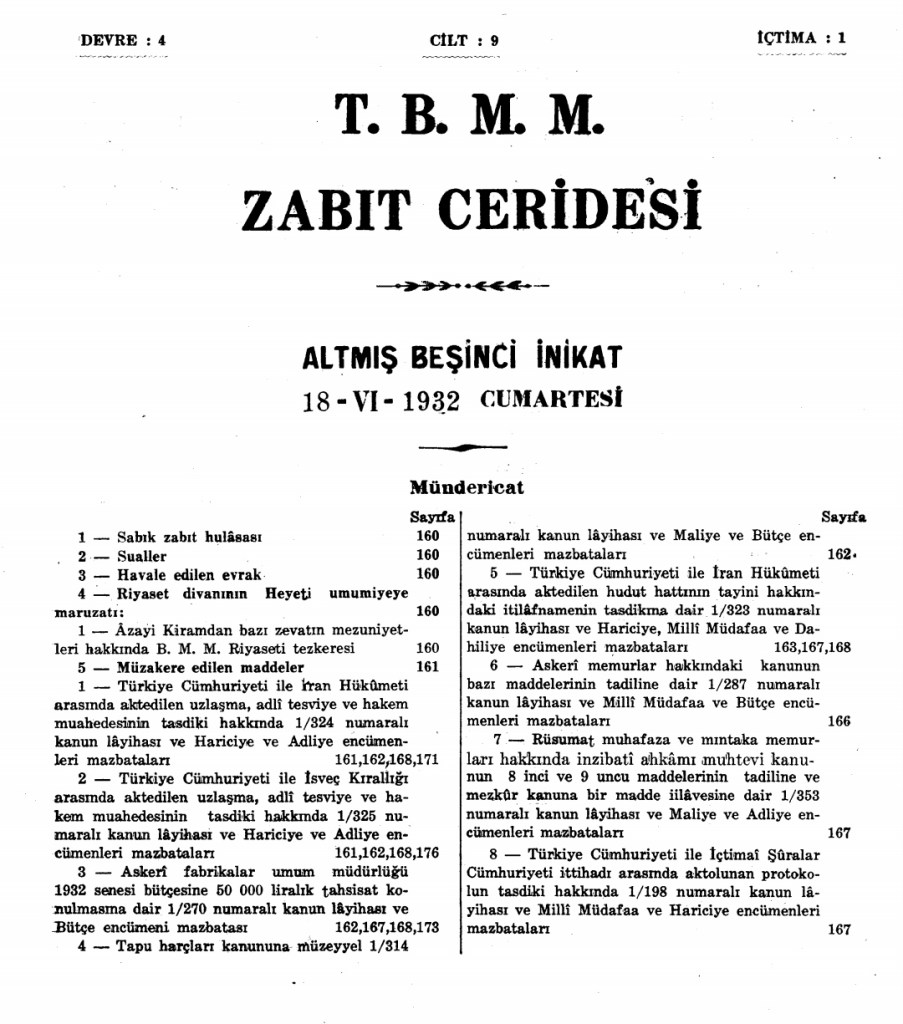 [2] no’lu dipnotta bahsi geçen;“Türkiye – Iran hudut hattının tayini hakkında Tahranda 23 Kânunusani (Ocak) 1932 tarihinde imzalanan itilâfnamenin tasdikına dair kanun”un TBMM’nin 18 Haziran 1932 tarihli ictimaında kabul edildiğini gösteren Meclis tutanağı…
