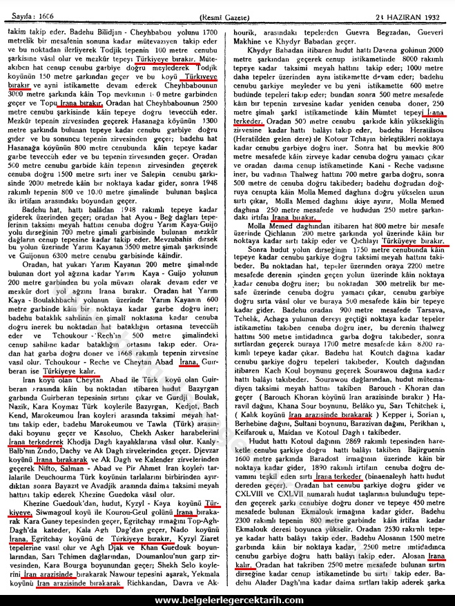 [3] no’lu dipnotta sözü edilen;“Türkiye – Iran hudut hattının tayini hakkında Tahranda 23 Kânunusani (Ocak) 1932 tarihinde imzalanan itilâfnamenin tasdikına dair kanun”un metni 23 Haziran 1932 tarihli Resmi Gazete’de böyle neşredildi…