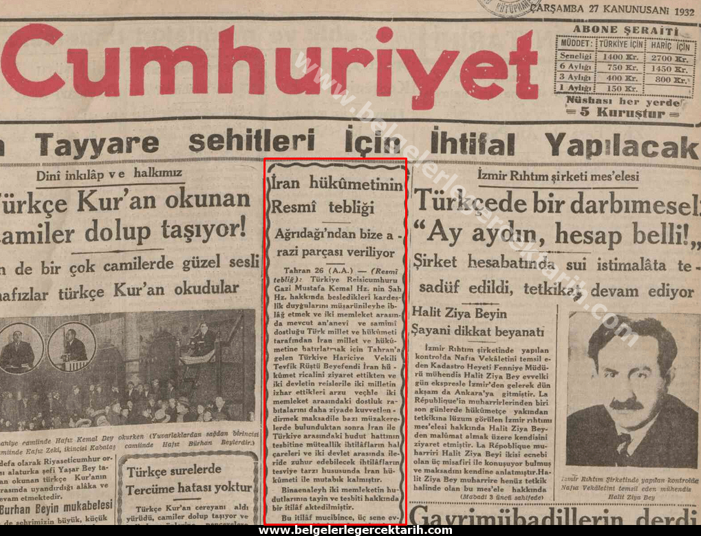 [1] no’lu dipnotta yer alan Iran Hükumeti’nin resmi tebliği, 27 Ocak 1932 tarihli Cumhuriyet gazetesinde böyle haber olmuştu…