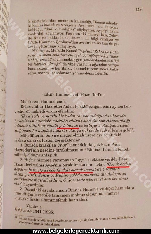 Öğrendiğimize göre Latife hanım M. Kemal ile anlaşamayınca “her nedense” onun “manevi kızları” olan Zehra ve Rukiye’yi de yanına alıp Çankaya Köşkü’nü terketmiş… Bu olaydan iki hafta sonra M.Kemal’in talimatıyla “Reisicumhur Özel Kalemi”nden Latife hanıma bir mektup gönderilir. Mektupta M. Kemal’in şu emirleri iletilir; “manevi kızlar” Zehra ile Rukiye geri gelecek, köşkte bırakılan küçük yaştaki “Ayşe” adlı kız ise köşkten gönderilecek. M. Kemal’in gerekçesi gayet açık; “hiçbir hizmete yaramıyor. Ben çocuk dadısı değilim!” Ayrıca Binnaz adlı hizmetçiye de “bunak” diyor. M. Kemal’in karakteri hakkında yeterince fikir veren bu mektubu virgülüne dahi dokunmadan buraya alıyorum…