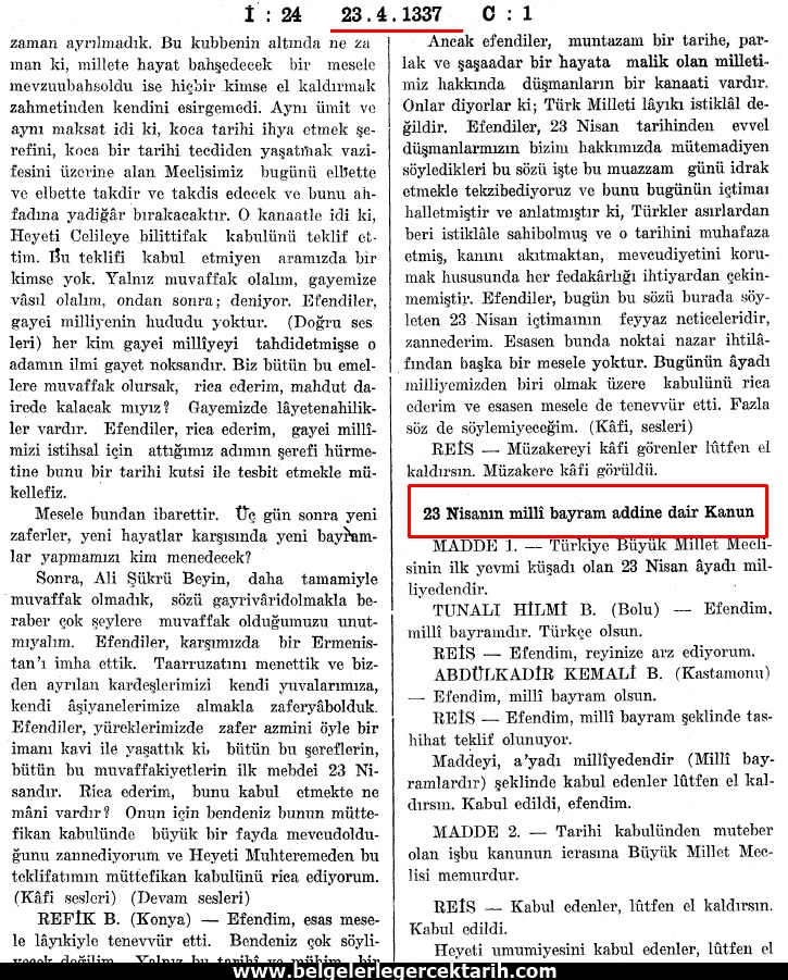 [8] no’lu dipnot ile alakalı Meclis tutanağı… “23 Nisan” ilk kez 23 Nisan 1337 (1921)’de kabul edilen kanunla “Milli Bayram” ilan edildi… O tarihte henüz çocuk Bayramı değildi…