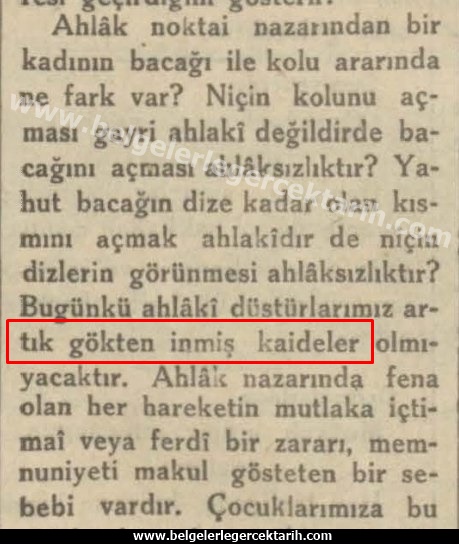 “Ahlak noktai nazarından (bakış açısından) bir kadının bacağı ile kolu arasında ne fark var? Niçin kolunu açması gayri ahlaki değildirde bacağını açması ahlaksızlıktır? Yahut bacağın dize kadar olan kısmını açmak ahlakidir de niçin dizlerin görünmesi ahlaksızlıktır? Bugünkü ahlaki düstürlarımız (ilkelerimiz) artık gökten inmiş kaideler (kural/kanunlar) olmıyacaktır.”[6]