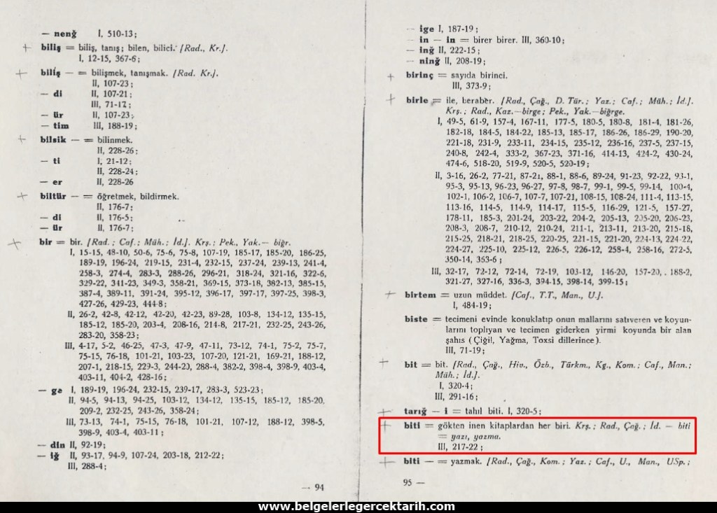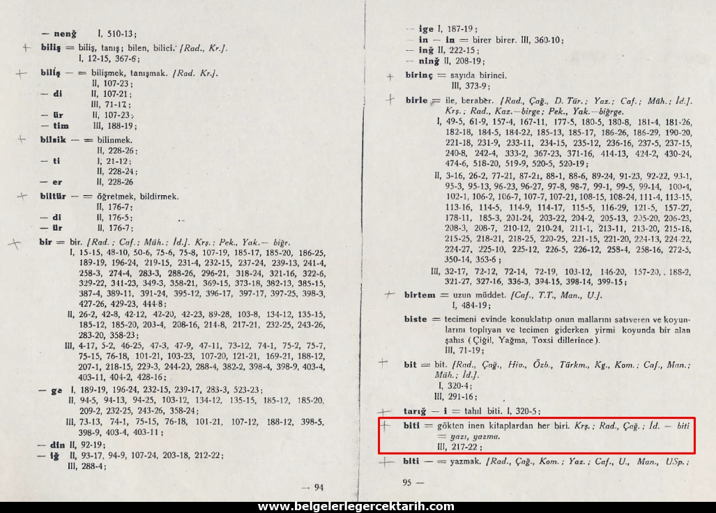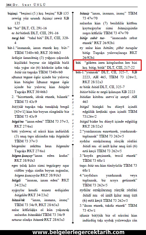 Şayet bu Ansiklopedi kemalistleri tatmin etmediyse, ki onlardan her şey beklenir, o halde Dr. Suat Ünlü’nün hazırladığı “Karahanlı Türkçesi Sözlüğü”ne de bakalım ve lügatte “biti” kavramına ne mana verilmiş görelim: “gökten inen kitaplardan her biri.”[11]
