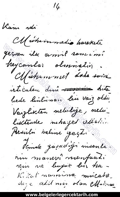 Yukarıdan beri yaptığımız nakillerden sonra bu mevzuun tamamen vuzuha kavuştuğunu düşünüyorum. Yazımızın ilk kısmında da ifade ettiğimiz gibi M. Kemal “vahye” inanmıyordu. “Lise Tarih” kitabı için 1930’da bizzat yazdığı metinlerin arşivlerde bulunduğu erbabına malumdur. Işte bu kitap için kaleme aldığı yazılar arasında Hz. Muhammed (sallallahu aleyhi ve sellem) Efendimiz ve Islamiyetin doğuşu ile ilgili kısımlar da vardı. Kağıda döktüğü aşağıdaki düşünceleri adeta “Gökten indiği sanılan kitaplar” sözünün bir açılımı mahiyetindedir: