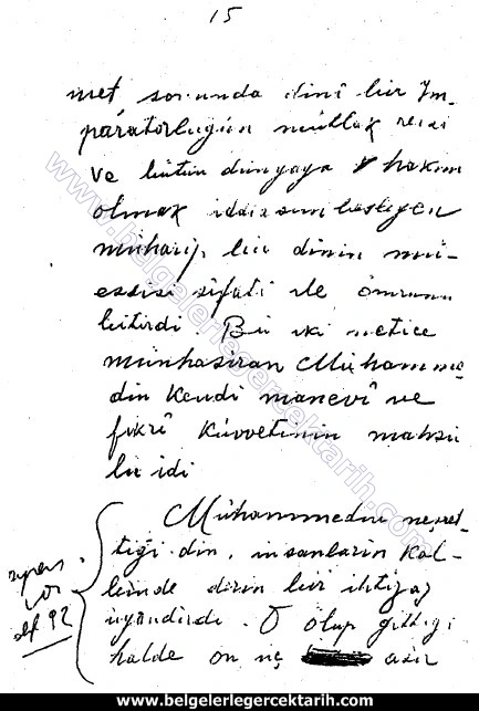 [15] no’lu dipnot ile ilgili… M. Kemal’in el yazısıyla yazdığı ve Anıtkabir Kütüphanesi’nde bulunan sayfalar…
