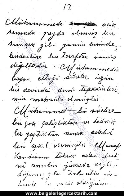 Gördüğünüz gibi o, “gökten indiği sanılan…” sözüyle, Hz. Peygamber (s.a.v) Efendimizin “Allah’tan vahiy almadığını” kastetmekte ve “beyan ettiği surelere birçok çalıştıktan ve tedkikler (incelemeler) yaptıktan sonra edebî bir şekil verdiğini” düşünmektedir. Nitekim son cümlede, “Bu iki netice münhasıran Muhammedin kendi manevî ve fikrî kuvvetinin mahsulü idi” diyerek tekrar vurgulamaktadır. Haşa… Ama öyle inanıyordu. Bunu çarpıtmanın bir manası yok. Fakat daha da vahimi, M. Kemal bu inancını ders kitaplarına koyup Müslüman çocuklara bile okuttu. Allah Teala o günleri bir daha yaşatmasın.