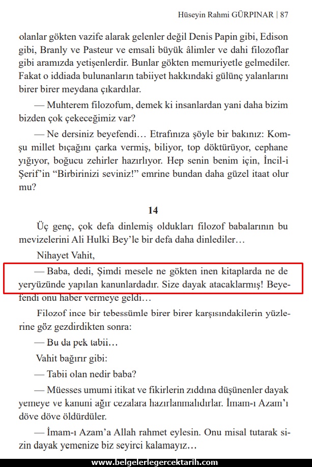 “Gökten inen kitap ve kaide”lerden kastedilenin Kur’an-ı Kerim ayetleri olduğunu sadece Hüseyin Rahmi ve kemalist Asım Us değil, aynı zamanda ittihatçıların ideoloğu Ziya Gökalp da ifade etmiştir. Alman tarihçi ve Türkoloji uzmanı Gotthard Jaeschke’nin “Yeni Türkiye’de Islamlık” namlı eserinden naklediyorum: