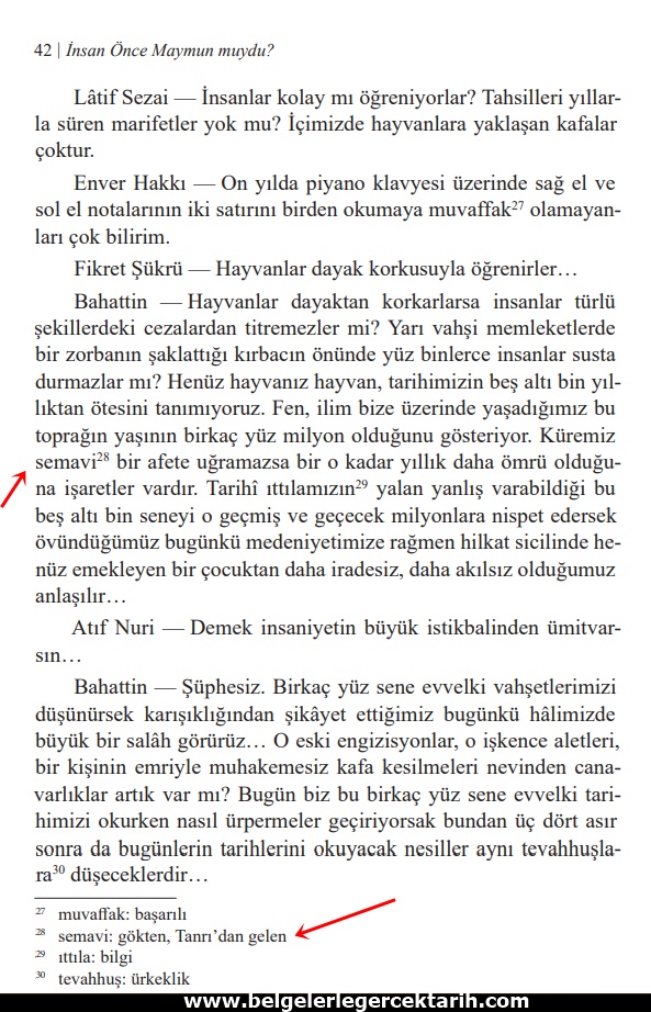Aslında bütün meseleyi özetleyen bir cümledir bu. Ancak biz yine de devam edelim. Aynı kitabın bir başka yerinde “semavi” kelimesinin manasını açmak üzere düşülen dipnotta şu açıklama yapılır: “gökten, Tanrı’dan gelen.”[5]