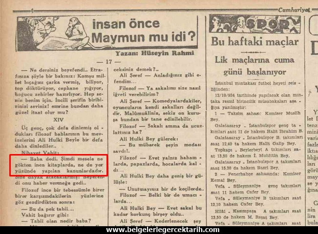 Ayrıca bakınız; Hüseyin Rahmi, “Insan Önce Maymun Mu idi?”, Cumhuriyet Gazetesi, 11 Ekim 1934.