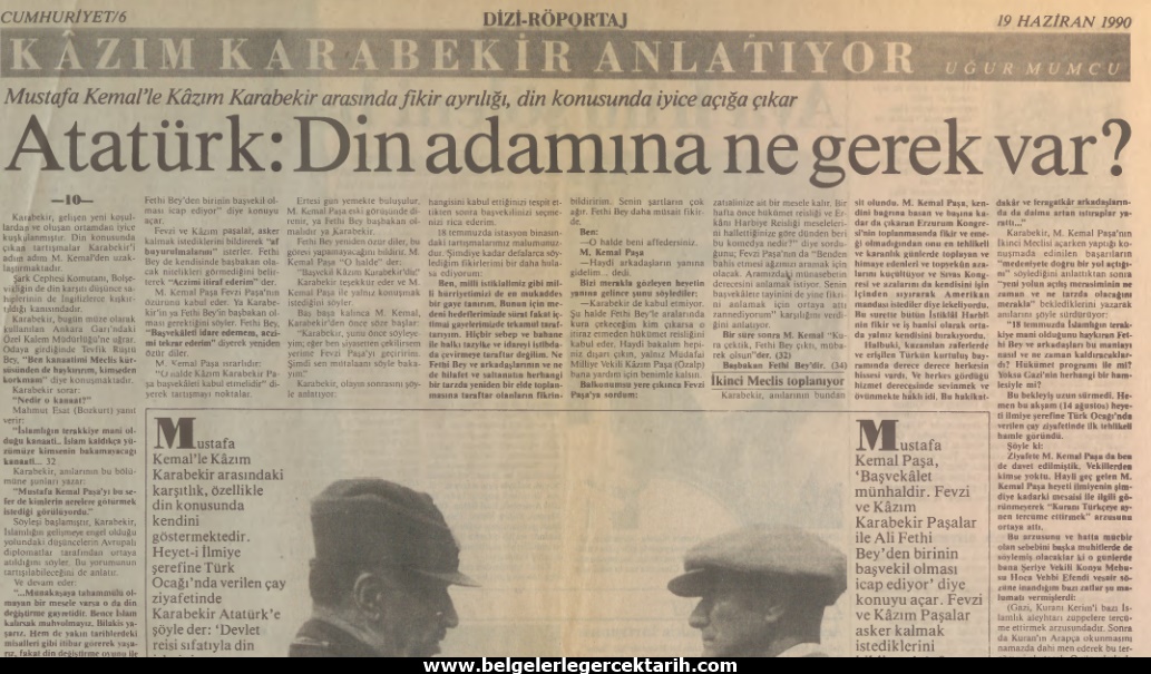 M. Kemal bu tarihlerden çok daha evvel, 1923 senesinde Kazım Karabekir Paşa ile münakaşa ederken “gerçek niyetini” açıkça ortaya koymuştu. Karabekir’in Uğur Mumcu tarafından Cumhuriyet gazetesinde neşredilen hatıralarından okuyalım: