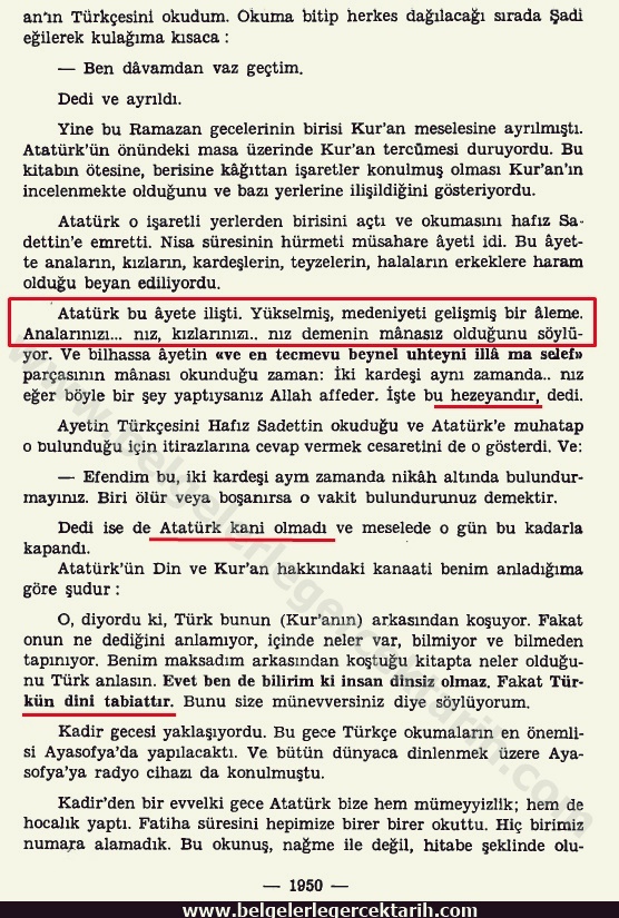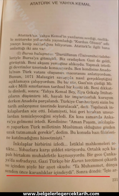 “Bir gece Çankaya’da sofradayız. Gazi (M. Kemal) Türkçe bir Kur’an tercümesi çıkardı ve içinden şöyle bir ayet okudu: ‘Ya Muhammed (Salavat!), dünya senden önce karanlıklar içindeydi.’ Sonra döndü: ‘Işte arkadaşlar, Türk milletini asırlarca geri bırakan her şeyi Kur’an’da arayan bu zihniyettir. Biz bunu yıkacağız. (…) Peki siz Islamiyet’ten önce dünyanın karanlıklar içinde olduğuna inanıyor musunuz?’