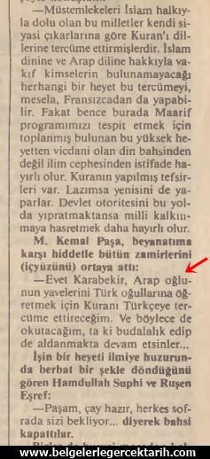 — Müstemlekeleri (sömürgeleri) Islam halkıyla dolu olan bu milletler kendi siyasi çıkarlarına göre Kur’an’ı dillerine tercüme ettirmişlerdir. Islam dinine ve arap diline hakkıyla vakıf kimselerin bulunamayacağı herhangi bir heyet bu tercümeyi, mesela Fransızcadan da yapabilir. Fakat bence burada Maarif (Öğretim ve eğitim) programımızı tesbit etmek için toplanmış bulunan bu yüksek heyetten vicdani olan din bahsinden değil ilim cephesinden istifade hayırlı olur. Kur’an’ın yapılmış tefsirleri var, lazımsa yenisini de yaparlar. Devlet otoritesini bu yolda yıpratmaktansa milli kalkınmaya hasr etmek daha hayırlı olur.